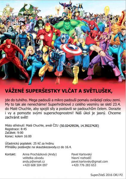 Vážené SuperŠestky vlčat a světlušek, jde do tuhého. Mega padouši a mikro padouši pomalu ovládají celou zemi. My to tak ale nenecháme! Superhrdinové z celého vesmíru se sletí 23.4. do Malé Chuchle, aby spojili síly a postavili se padouchům čelem. Dorazte i vy a pomozte svými superschopnostmi! Náš úkol je jasný. Chceme zachránit svět! Přihlašování probíhá na skautskezavody.cz, nejpozději do 16.4. (ale zbytečně to neodkládejte).